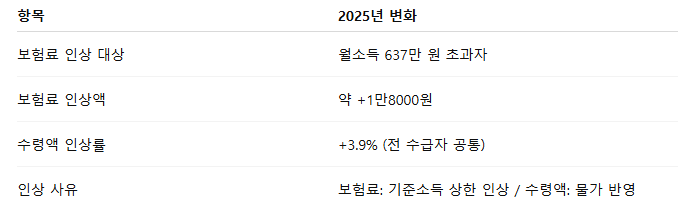 2025년 7월부터 월소득 637만 원 초과 고소득자의 국민연금 보장료가 1만 8000원 인상됩니다.