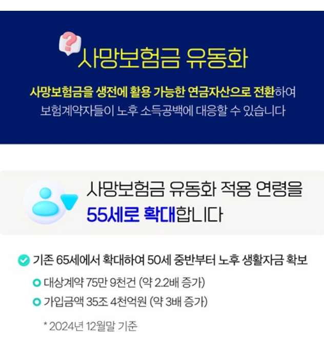 👉 2025년 10월부터는 55세 이상이면, 본인이 직접 사망보장금을 연금처럼 나누어 받을 수 있게 됩니다.