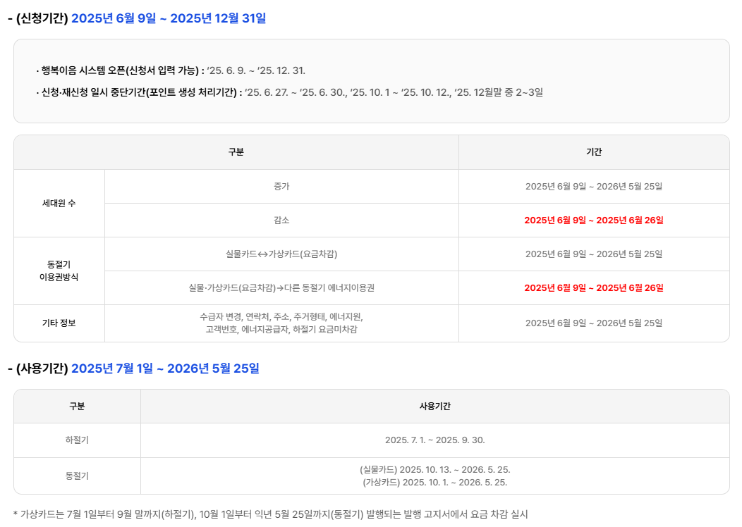 에너지바우처 신청은 2025년 6월 9일부터 12월 31일까지입니다. 늦지 않게 신청해야 하며, 지원은 신청 기준 월부터 소급 없이 시작됩니다.